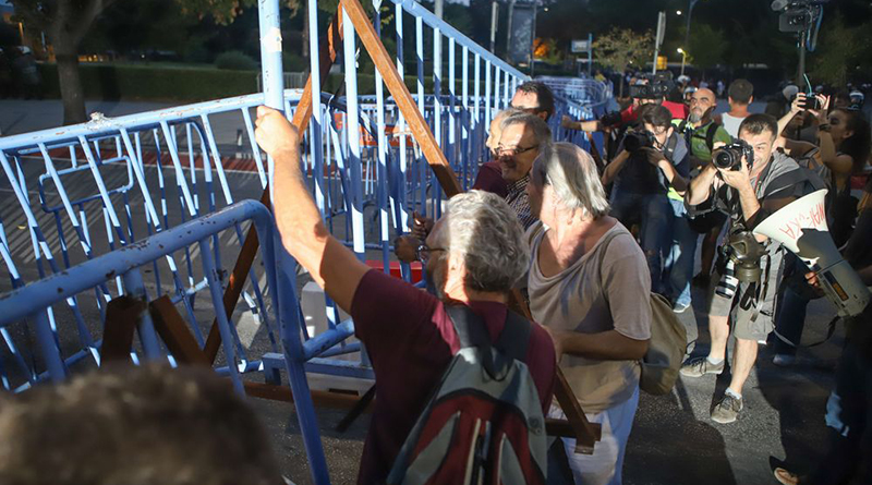 Τον φραγμό που έχει στηθεί με κάγκελα στο ύψος της οδού Μ. Ανδρόνικου, κοντά στο Συνεδριακό Κέντρο Ιωάννης Βελλίδης επιχείρησαν να σπάσουν πριν από λίγο διαδηλωτές που συμμετείχαν στο μπλοκ της ΑΝΤΑΡΣΥΑ και άλλων αριστερών οργανώσεων.