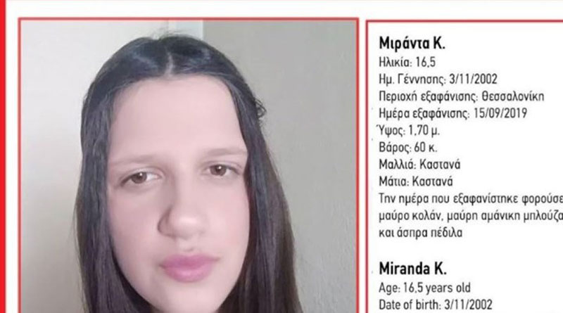 “Στις 15/09/2019, και ώρα 18:00, εξαφανίστηκε από την πόλη της Θεσσαλονίκης, η Μιράντα Κ., 16,5 ετών. Για την εν λόγω εξαφάνιση, ενημερωθήκαμε σήμερα 16/09/2019 απογευματινές ώρες, όταν και λάβαμε τα απαραίτητα στοιχεία του παιδιού, προκειμένου να προβούμε στη δημοσιοποίησή τους.