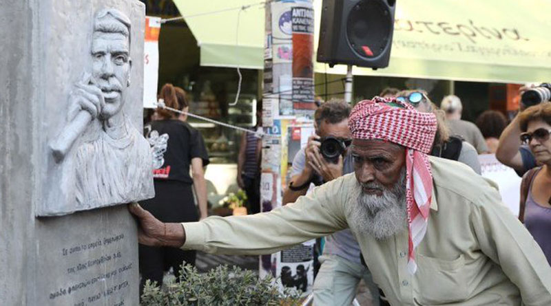 Η Μάγδα Φύσσα μητέρα του δολοφονημένου από χρυσαυγίτες Παύλου Φύσσα, δείχνει στον πατέρα του, επίσης δολοφονημένου από φασίστες, Σαχζάτ Λουκμάν, το μνημείο του γιου της, κατά τη διάρκεια της αντιφασιστικής συγκέντρωσης στο Κερατσίνι: