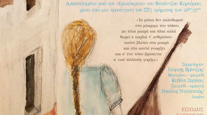 Το τμήμα Στ3 από το σχολικό συγκρότημα του 28ου και 57ου Δημοτικών σχολείων Ηρακλείου και με συνδιοργανωτή την Περιφέρεια Κρήτης ανεβάζει για τρίτη συνεχή φορά, θεατρικά τον Ερωτόκριτο του Βιτσέντζου Κορνάρου, στο κηποθέατρο «Μάνος Χατζιδάκις», την Τετάρτη 25 Σεπτεμβρίου, ώρα 20.00 , τιμώντας το έτος Ερωτόκριτου όπως έχει οριστεί το 2019.
