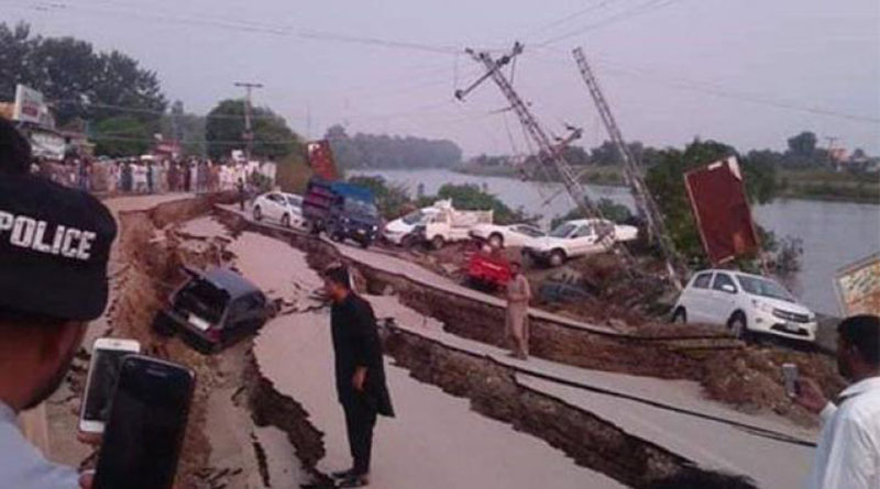 Φωτογραφίες και βίντεο από ΜΜΕ δείχνουν ένα κτίριο που έχει καταρρεύσει και αρκετά μεγάλες ρωγμές σε δρόμους στη Μιρπούρ, μια πόλη στην πακιστανική πλευρά της διαφιλονικούμενης περιοχής του Κασμίρ κοντά στην Ινδία.