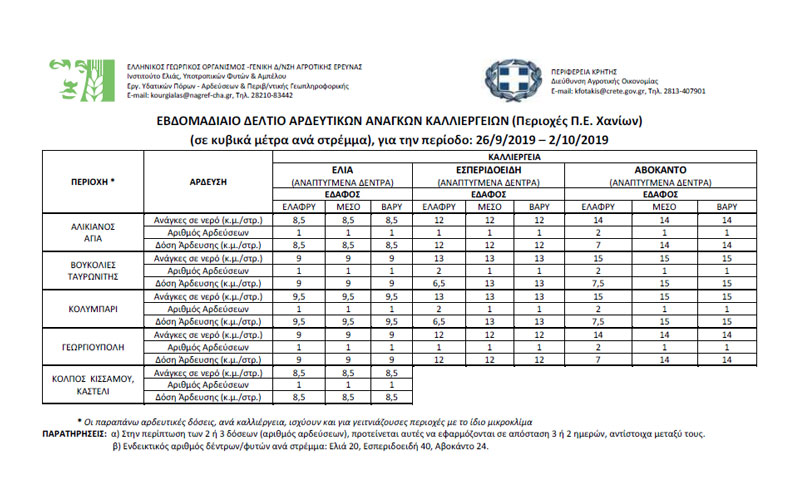 Ανακοίνωση εξέδωσε η Διεύθυνση Αγροτικής Οικονομίας της Περιφέρειας Κρήτης, μέσω της οποίας παρουσιάζει τα αρδευτικά δελτία και των τεσσάρων νομών της Κρήτης για την εβδομάδα από 26/09 έως 02/10/2019.