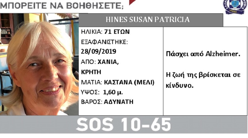 Ο λόγος για τη Γερμανίδα Hines Susan Patricia, η οποία πάσχει από αλτσχάιμερ. Όπως ανέφερε οικείος της, η γυναίκα εντοπίστηκε στην περιοχή της Σούδας, ενώ ευχαρίστησε όσους τους στήριξαν και κινητοποιήθηκαν σε αυτή τη στιγμή: