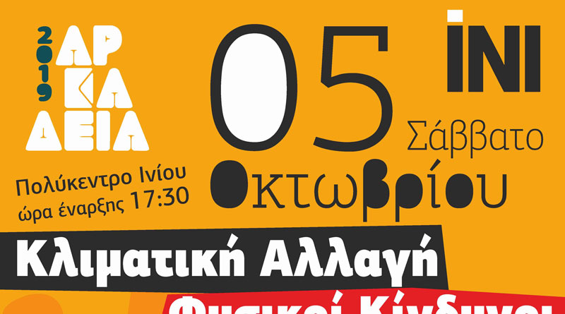 Θέμα της εκδήλωσης είναι «Κλιματική Αλλαγή-Φυσικοί Κίνδυνοι-Αντιμετώπιση Έκτακτων Αναγκών» και θα πραγματοποιηθεί το Σάββατο 5 Οκτωβρίου 2019 στις 17:30 το απόγευμα στο Πολύκεντρο Ινίου με ελεύθερη είσοδο για τους πολίτες.