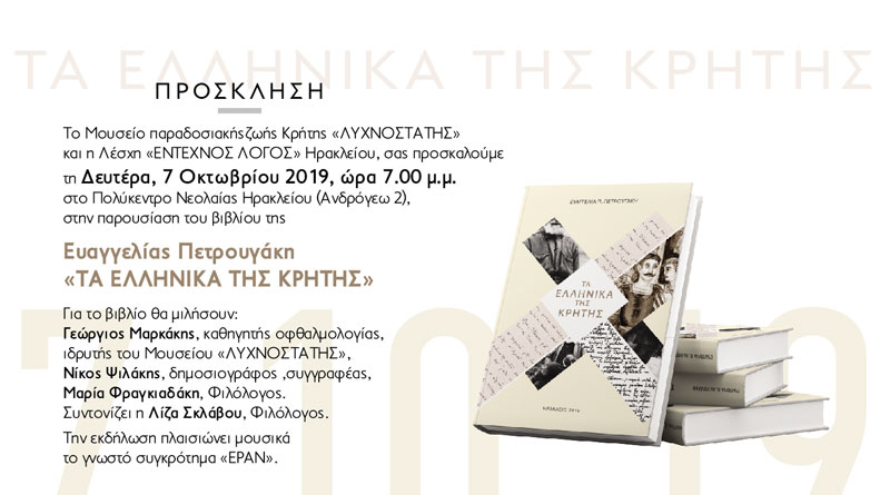 Τη Δευτέρα, 7 Οκτωβρίου, στις 7 μ.μ., στο Πολύκεντρο Νεολαίας του Δ. Η. (ισόγειο οδού Ανδρόγεω 2), θα γίνει η παρουσίαση του νέου βιβλίου της Ευαγελίας Πετρουγάκη με τίτλο «Τα Ελληνικά της Κρήτης».