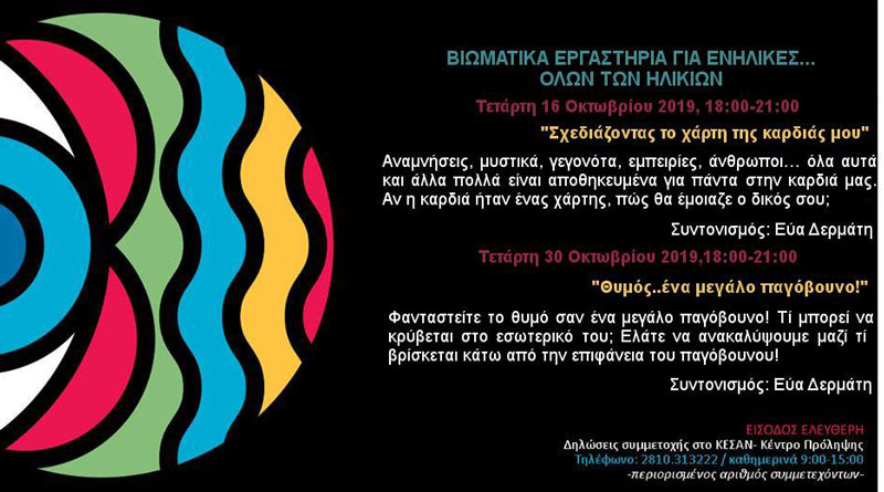 Στα βιωματικά αυτά εργαστήρια, που ξεκινούν την Τετάρτη 16 Οκτωβρίου, η είσοδος είναι ελεύθερη ενώ είναι περιορισμένος ο αριθμός συμμετεχόντων. Για δηλώσεις συμμετοχής στο: ΚΕΣΑΝ – Κέντρο Πρόληψης, τηλέφωνο 2810.313222 (καθημερινά 9:00-15:00). Τα Βιωματικά Εργαστήρια και οι Συναντήσεις Γονέων πραγματοποιούνται στο χώρο του MOVERΕ (Διεύθυνση: Πλατεία Κύπρου και Λεωφόρος Κνωσού 1, στο ισόγειο του 7ου Δημοτικού Σχολείου Ηρακλείου, απέναντι από την Όαση.)