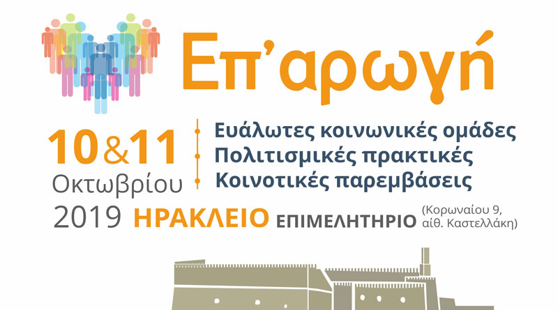 Το Κέντρο Κοινωνικής Πρόνοιας Κρήτης διοργανώνει το 9ο Πανελλήνιο Συνέδριο Μονάδων Κοινωνικής Φροντίδας «Επ΄ Αρωγή», 11 και 12 Οκτωβρίου 2019 στο Επιμελητήριο Ηρακλείου με θέμα: «Ευάλωτες Κοινωνικές Ομάδες, Πολιτισμικές Πρακτικές και Κοινοτικές Παρεμβάσεις» (ώρα έναρξης 09:00). Το Συνέδριο διοργανώνεται από το Κέντρο Κοινωνικής Πρόνοιας της Περιφέρειας Κρήτης υπό την αιγίδα του Υπουργείου Εργασίας και Κοινωνικών Υποθέσεων, της Περιφέρειας Κρήτης και του Δήμου Ηρακλείου.