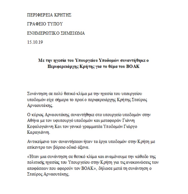 Ο κύριος Αρναουτάκης συναντήθηκε στο υπουργείο υποδομών στην Αθήνα με τον υφυπουργό υποδομών και μεταφορών Γιάννη Κεφαλογιάννη και τον γενικό γραμματέα Υποδομών Γιώργο Καραγιάννη.