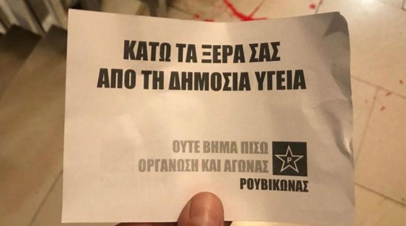 Τέσσερα άτομα της αναρχικής συλλογικότητας πραγματοποίησαν παρέμβαση το μεσημέρι της Παρασκευής στο πολιτικό γραφείο του υπουργού Υγείας, πετώντας τρικάκια και μπογιές στην πόρτα.