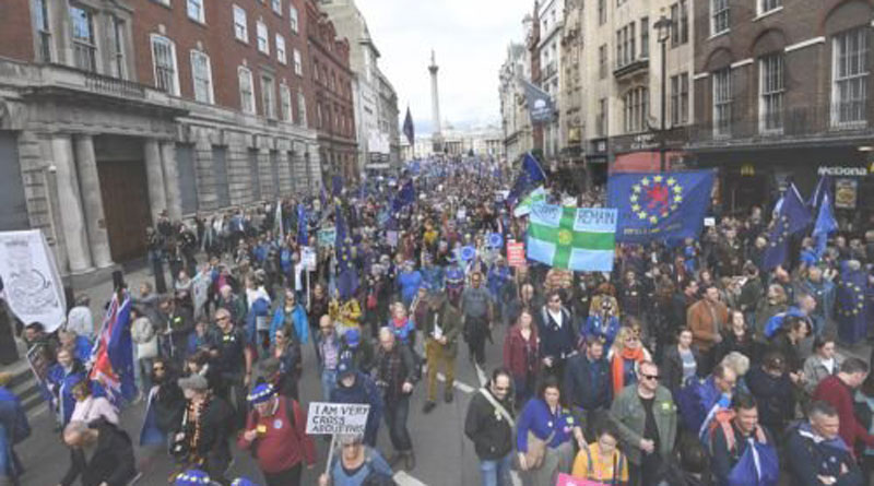 Εκατοντάδες χιλιάδες Βρετανοί συγκεντρώθηκαν σήμερα στο κεντρικό Λονδίνο ζητώντας να διεξαχθεί νέο δημοψήφισμα για το Brexit και πανηγύρισαν όταν έγινε γνωστό ότι η Βουλή των Κοινοτήτων ψήφισε υπέρ της αναβολής της αποχώρησης της Βρετανίας από την Ευρωπαϊκή Ένωση.