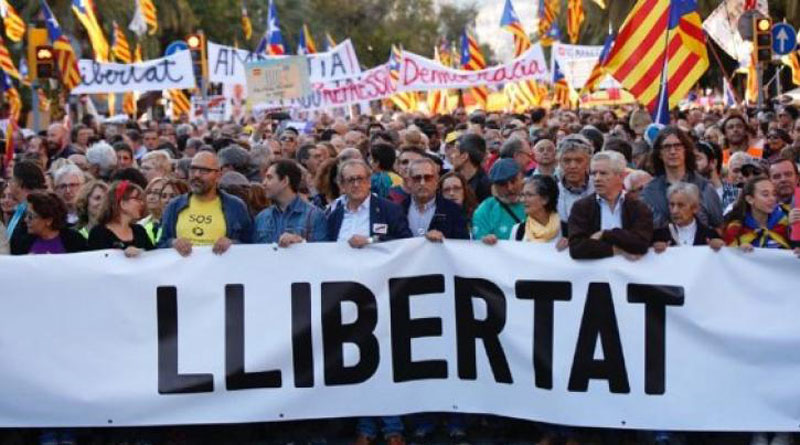 Εκατοντάδες χιλιάδες άτομα διαδήλωσαν το Σάββατο στην Βαρκελώνη με αίτημα την απελευθέρωση των εννέα ηγετών του κινήματος ανεξαρτητοποίησης της περιοχής από την Iσπανία.