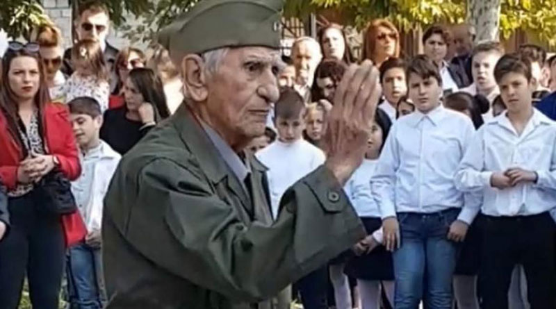 Μπορεί να έχει φτάσει στα 90 του χρόνια, αλλά ο παλαίμαχος αγωνιστής Μιχάλης Αηδονίδης δεν παρέλειψε και φέτος να δώσει το παρών στην κατάθεση στεφάνου προς τιμήν των πεσόντων του πολέμου του ’40 εκ μέρους των αγωνιστών της Εθνικής Αντίστασης και του Δημοκρατικού Στρατού.