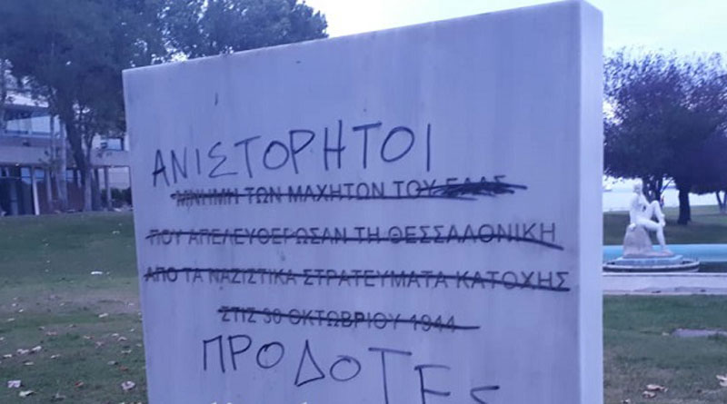 «Ανιστόρητοι» και «προδότες», έγραψαν άγνωστοι την αναθηματική πλάκα που έχει τοποθετηθεί κοντά στο Βασιλικό θέατρο, για την απελευθέρωση της Θεσσαλονίκης από τα ναζιστικά στρατεύματα Κατοχής, στις 30 Οκτωβρίου 1944.