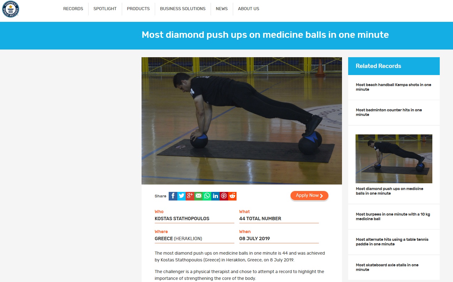 Παγκόσμιο ρεκόρ Γκίνες κατέρριψε Ηρακλειώτης, καταφέρνοντας να κάνει τις περισσότερες κάμψεις με κλειστή λαβή πάνω σε ιατρικές μπάλες. Ο φυσικοθεραπευτής και αθλητής του Iron Body, Κώστας Σταθόπουλος, εκτέλεσε 44 επαναλήψεις σε ένα λεπτό, ξεπερνώντας το προηγούμενο ρεκόρ κατά 3 επαναλήψεις!