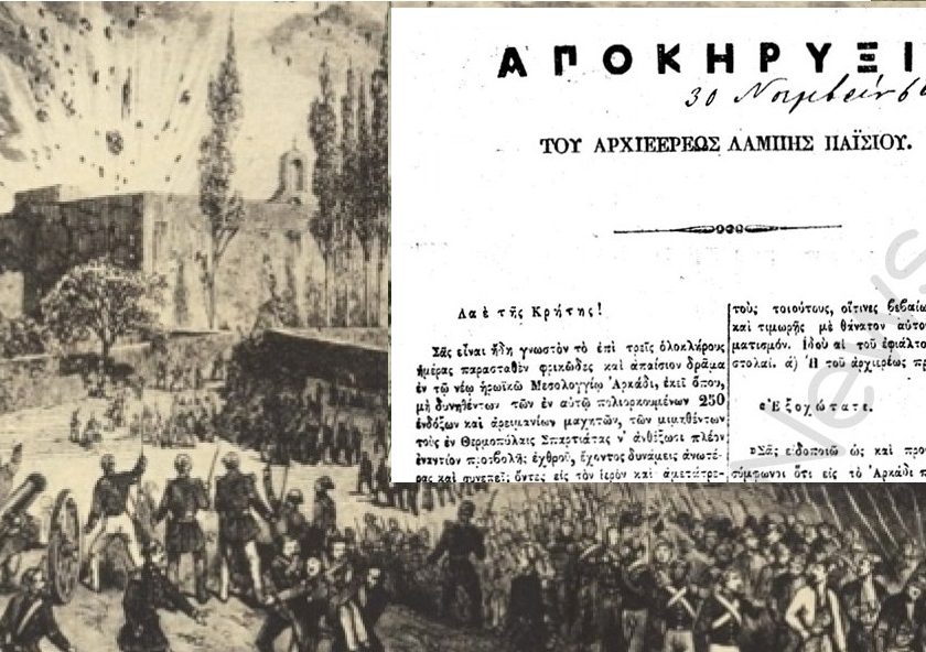 Σας είναι ήδη γνωστόν το επί τρεις ολοκλήρους ημέρας παρασταθέν φρικώδες και απαίσιον δράμα εν τω νέω ηρωικώ Μεσολογγίω Αρκάδι, εκεί όπου, μη δυνηθέντων των εν αυτώ πολιορκουμένων 250 ενδόξων και αρειμανίων μαχητών, των μιμηθέντων τους εν Θερμοπύλαις Σπαρτιάτας ν’ ανθέξωσι πλέον εναντίον προσβολής εχθρού, έχοντος δυνάμεις ανωτέρας, και συνεπείς όντες εις τον ιερόν και αμετάτρεπτον όρκον, τον οποίον ενώπιον του Υψίστου έδωκαν του να μη παραδοθώσι ζώντες εις τας χείρας του εχθρού, έθεσαν πυρ και ανετινάχθησαν εις τον αέρα και μετ’ αυτών πλείστα γυναικόπαιδα και πλέον των 2500 Τούρκων. Εκεί όπου, εισβαλόντος του εχθρού, γέροντες εκρεουργήθησαν, ζώντα βρέφη εις φρούρνους κατεκάησαν, εγγύων γυναικών αι κοιλίαι κατασχίθησαν, ιεροσιλείαι διεπράχθησαν και πλείστα άλλα κακουργήματα, άτινα κατεσυνεκίνησαν όλον τον κόσμον. Τις δε η αιτία όλων τούτων; Τις ο οδηγήσας τον εχθρόν εις Αρκάδι; Τις ο προδώσας αυτό; Φευ! Ο αρχιερεύς της επαρχίας Λάμπης, ο εφιάλτης ούτος και ουχί λειτουργός του Υψίστου, όστις αντί να μιμηθή εν ταις παρούσαις περιστάσεσι της πατρίδος του τον ένδοξον και αοίδοιμον εν Καλαβρύτοις Αρχιερέα Γερμανόν, τον αναπετάσαντα την σημαίαν της ελευθερίας, αντί να μιμηθή τον χάριν της πατρίδος του υποστάντα τον φρικώδη της αγχόνης θάνατον, τον αθάνατον Πατριάρχην Γρηγόριον, τουνατνίον εμιμήθη τον ισκαριώτην Ιούδαν, τον προδώσαντα, χάριν αργυρίου, τον Κύριον ημών Ιησούν Χριστόν.