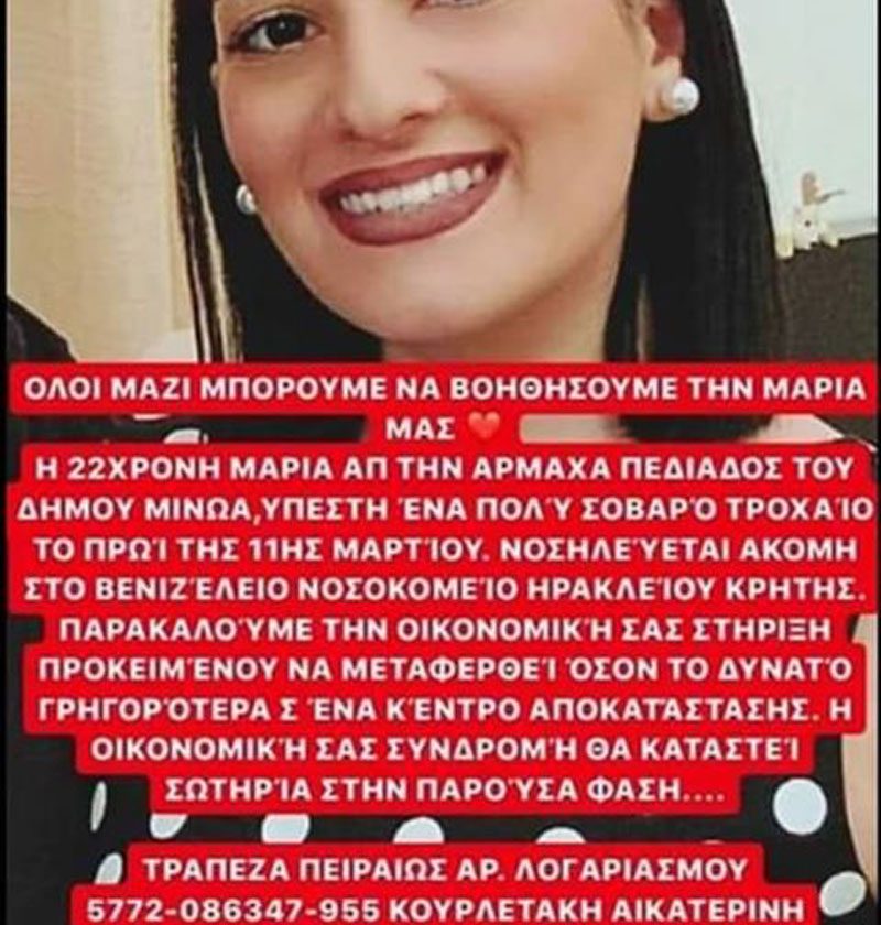«Η 22χρονη Μαρία από την Αρμάχα Πεδιάδος του Δήμου Μινώα υπέστη ένα πολύ σοβαρό τροχαίο το πρωί της 11ης Μαρτίου. Νοσηλεύεται ακόμη στο Βενιζέλειο Νοσοκομείο Ηρακλείου Κρήτης. Παρακαλούμε την οικονομική σας στήριξη, προκειμένου να μεταφερθεί όσον το δυνατό γρηγορότερα σε ένα κέντρο αποκατάστασης. Η οικονομική σας συνδρομή θα καταστεί σωτηρία στην παρούσα φάση…