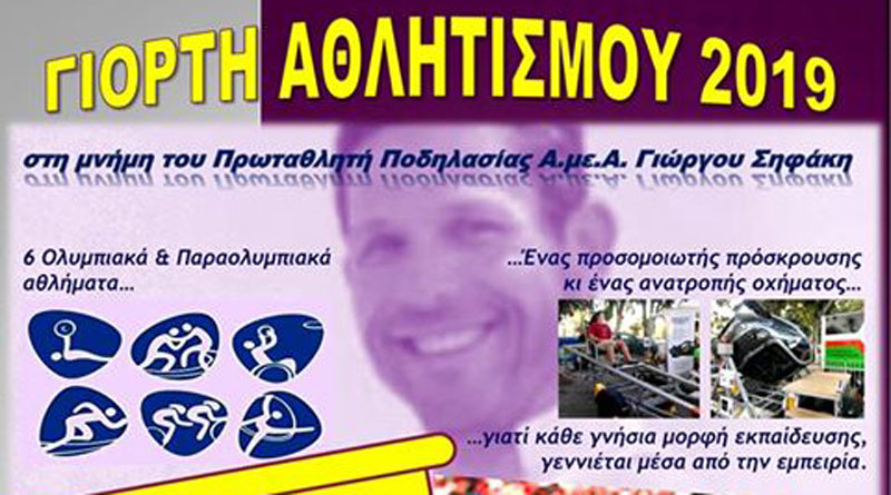 Με την παρουσία της Χρυσής Ολυμπιονίκη και Αντιπεριφερειάρχη Θεσσαλονίκης κας.Βούλας Πατουλίδου και του Ομοσπονδιακού Προπονητή Άρσης Βαρών σε Πάγκο κ.Δημήτρη Ιωαννίδη θα πραγματοποιηθεί την Παρασκευή 22 Νοεμβρίου 2019 από τις 9π.μ. έως και τις 2:00μ.μ. στο Νέο Κλειστό Γυμναστήριο «Δύο Αοράκια» η φετινή «Γιορτή Αθλητισμού Στη Μνήμη του Πρωταθλητή Ποδηλασίας Α.με.Α. Γιώργου Σηφάκη» που διοργανώνει ο Αθλητικός Σύλλογος ΠΑΛ.ΕΥ.Ε. με την στήριξη της Περιφέρειας Κρήτης και του Δήμου Ηρακλείου.