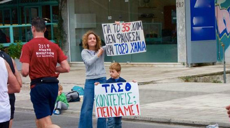 Το ένα που κρατούσε η μητέρα έγραφε: «Για το 35ο χλμ δεν φαίνεσαι και τόσο χάλια», ενώ το πανό του μικρού παιδιού: «Τάσο κοντεύεις; Πεινάμε!»