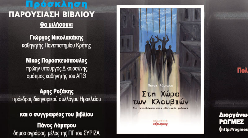 Ο ιστότοπος «ΡΩΓΜΕΣ» χώρος ιδεών διαλόγου και δράσης, παρουσιάζει το βιβλίο του Πάνου Λάμπρου «Στη χώρα των κλουβιών – Μία περιπλάνηση στις ελληνικές φυλακές» την Παρασκευή 15 Νοεμβρίου 2019 στις 7.30 μ.μ. στο Πολύκεντρο Νεολαίας του Δήμου Ηρακλείου. Εκτός από το συγγραφέα, για το βιβλίο και τα πολιτικά και κοινωνικά θέματα που θέτει θα μιλήσουν: ο Γιώργος Νικολακάκης, καθηγητής πανεπιστημίου Κρήτης, ο πρώην υπουργός Δικαιοσύνης, ομότιμος καθηγητής του ΑΠΘ Νίκος Παρασκευόπουλος και ο πρόεδρος του δικηγορικού συλλόγου Ηρακλείου Άρης Ροζάκης. Θα ακολουθήσει συζήτηση.