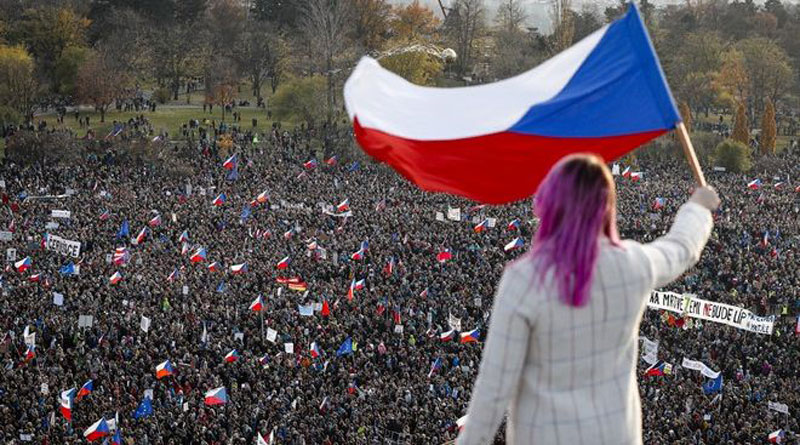 Οι διαδηλωτές από ολόκληρη την Τσεχία των 10,7 εκατομμυρίων κατοίκων συγκεντρώθηκαν στο πάρκο Λέτνα της Πράγας κρατώντας σημαίες της Τσεχίας και της ΕΕ, στο σημείο που έγιναν οι μεγαλύτερες διαδηλώσεις το Νοέμβριο του 1989, όταν το κομμουνιστικό καθεστώς στην (τότε) Τσεχοσλοβακία κατέρρευσε ειρηνικά, εβδομάδες μετά την πτώση του Τείχους στο Βερολίνο.