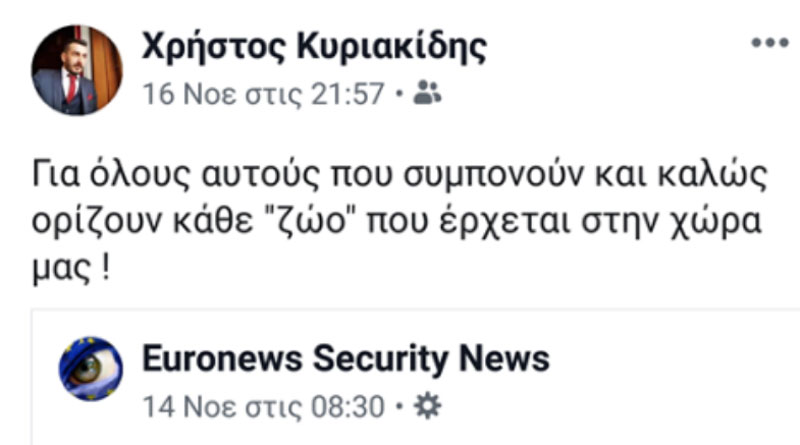 Πρωτεργάτης των Μακεδονομάχων ο αντιδήμαρχος καθαριότητας Δράμας Χρήστος Κυριακίδης επιτίθεται σε όσους «συμπονούν» τους πρόσφυγες και μετανάστες τους οποίους αποκαλεί “ζώα” σε μια επίδειξη ακροδεξιού μίσους και μισανθρωπισμού.