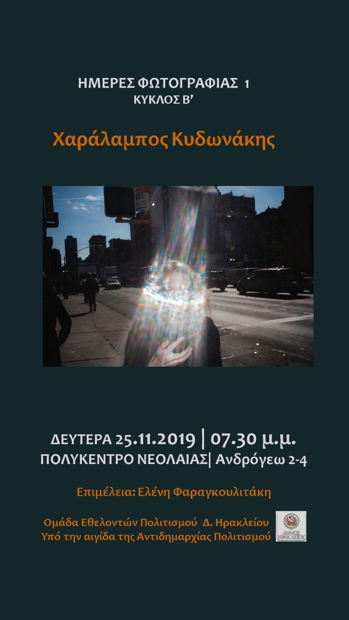 Mε το καλλιτεχνικό- φωτογραφικό έργο του Χαράλαμπου Κυδωνάκη ξεκινά τη Δευτέρα 25 Νοεμβρίου και ώρα 19.30, στο Πολύκεντρο Νεολαίας (Ανδρόγεω 2-4), ο Β’ κύκλος των «Ημερών Φωτογραφίας», που οργανώνει η ομάδα Εθελοντών Πολιτισμού του Δήμου Ηρακλείου, υπό την αιγίδα της Αντιδημαρχίας Πολιτισμού-Εθελοντισμού & Μνημείων.