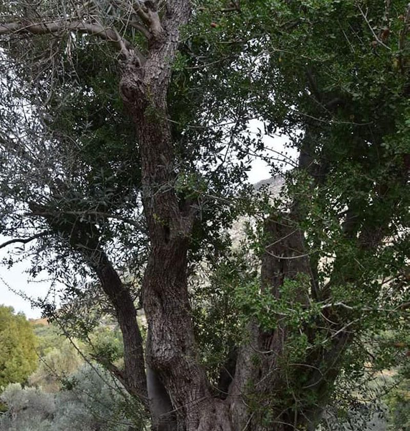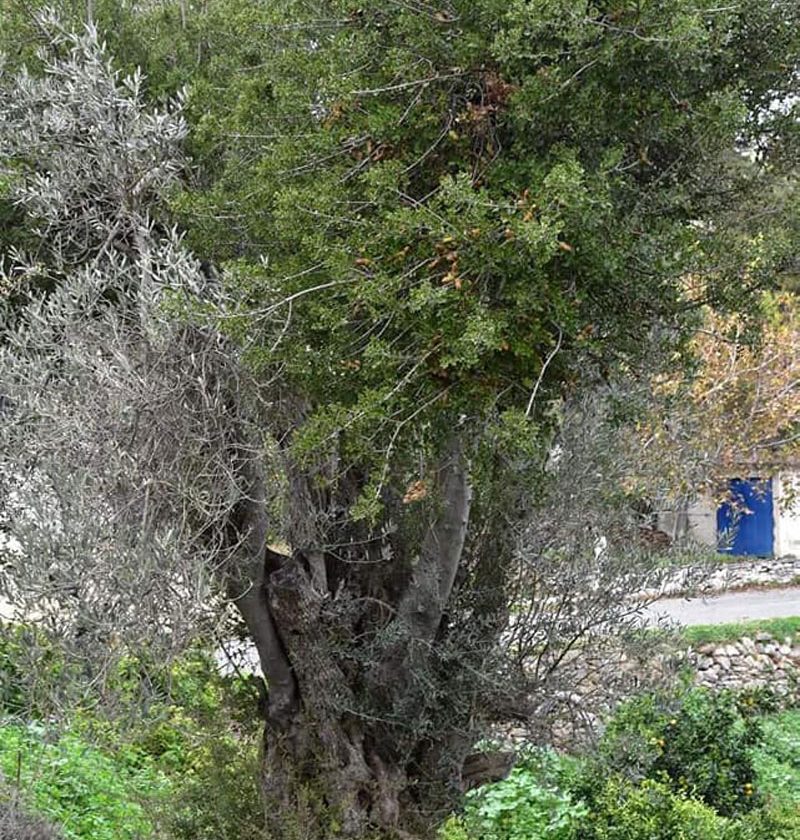 Κάποιος καρπός από γειτονική βελανιδιά που φύτρωσε στην κουφάλα της ελιάς μεγάλωσε και έγινε δένδρο δημιουργώντας το παράξενο αυτό συμπλεγμα που βλέπουμε στις φωτό του Μανώλη Ντρετάκη: