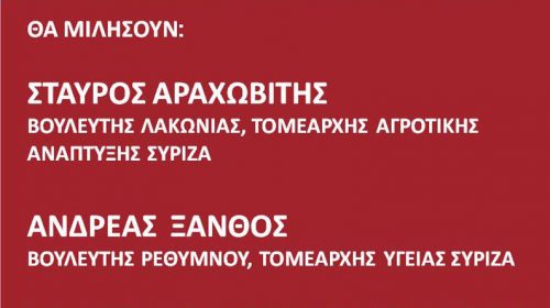 Ο Βουλευτής Ρεθύμνου Ανδρέας Ξανθός και η Νομαρχιακή Επιτροπή Ρεθύμνου του ΣΥΡΙΖΑ διοργανώνουν την Δευτέρα 2 Δεκεμβρίου 2019 και ώρα 14:00 στο Δημαρχείο Ρεθύμνου (Αίθουσα Δημοτικού Συμβουλίου), ανοιχτή σύσκεψη εκπροσώπων ελαιοκομικών φορέων και ελαιοπαραγωγών με θέμα την φετινή ελαιοκομική χρονιά και τα προβλήματα της ελιάς και του ελαιολάδου, με εισηγητή τον Σταύρο Αραχωβίτη, Βουλευτή Λακωνίας, Τομεάρχη Αγροτικής Ανάπτυξης του ΣΥΡΙΖΑ…