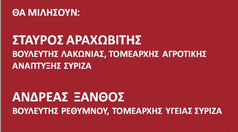 Την ίδια μέρα Δευτέρα 2/12 στις 19:00 θα πραγματοποιηθεί ανοιχτή εκδήλωση-συζήτηση του ΣΥΡΙΖΑ-Προοδευτική Συμμαχία στα Λειβάδια Μυλοποτάμου. Με κεντρικούς ομιλητές τον Σταύρο Αραχωβίτη και τον Ανδρέα Ξανθό.