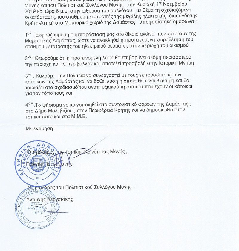 Κοινό ψήφισμα εξέδωσε η τοπική κοινότητα και ο πολιτιστικός σύλλογος της Μονής Μαλεβιζίου, μέσω του οποίου εκφράζουν την συμπαράστασή τους στη Δαμάστα, για τη σχεδιαζόμενη εγκατάσταση του σταθμού μετατροπής της μεγάλης ηλεκτρικής διασύνδεσης Κρήτης – Αττικής.