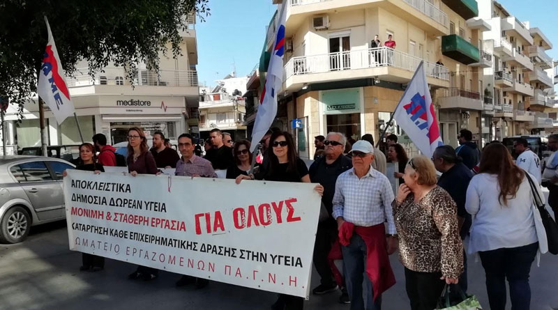 Να διεκδικήσει ένα αποκλειστικά κρατικό σύστημα Υγείας – Πρόνοιας, καθολικό, σύγχρονο και απολύτως δωρεάν. Ενα σύστημα Υγείας – Πρόνοιας χωρίς καμία επιχειρηματική δράση, που οι υπηρεσίες του θα αποτελούν στην πράξη κατοχυρωμένο κοινωνικό αγαθό και όχι όπως σήμερα ακριβοπληρωμένο εμπόρευμα. Με πλήρη κρατική χρηματοδότηση των δημόσιων Μονάδων Υγείας, με αντίστοιχη αύξηση των κονδυλίων από τον κρατικό προϋπολογισμό με κατάργηση των εισφορών των εργαζομένων στον κλάδο Υγείας των ασφαλιστικών ταμείων, όπου θα παρέχονται από το κράτος δωρεάν όλες οι εξετάσεις, θεραπείες, υγειονομικό υλικό, φάρμακα, εμβόλια, χωρίς πληρωμές, συμμετοχές, χωρίς πλαφόν και περικοπές, σύμφωνα με τις ανάγκες και με αποκλειστικά επιστημονικά κριτήρια.