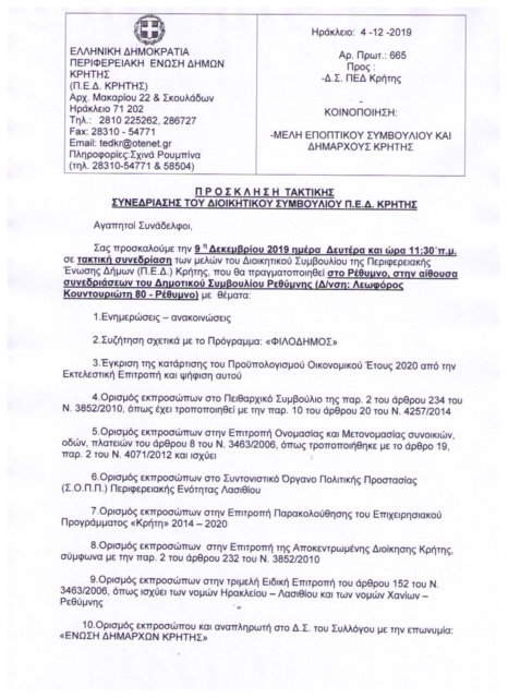 Την πρώτη συνεδρίασή της, μετά τη συγκρότησή της, πραγματοποιεί σήμερα η νέα διοίκηση της Περιφερειακής Ένωσης Δήων Κρήτης. Η συνεδρίαση θα πραγματοποιηθεί στις 11:30 το πρωί στο δημαρχείο Ρεθύμνου.