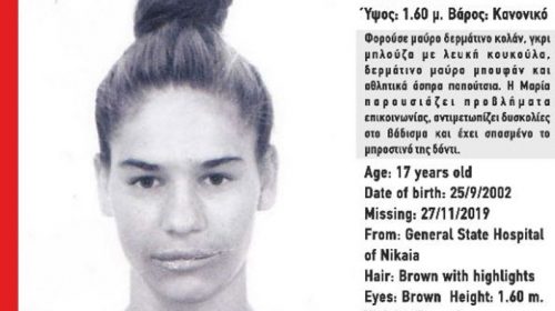 Το Χαμόγελο του Παιδιού έδωσε στη δημοσιότητα τα στοιχεία και τη φωτογραφία της 17χρονης Μαρίας Θ., η οποία εξαφανίστηκε στις 27/11/2019 και ώρα 11:00 από το Γενικό Κρατικό Νοσοκομείο Νίκαιας. Σύμφωνα με την ανακοίνωση από το Χαμόγελο του Παιδιού «Η Μαρία Θ. έχει ύψος 1.60 μ., έχει κανονικό βάρος, έχει καστανά μαλλιά και καστανά μάτια. Φορούσε μαύρο δερμάτινο κολάν, γκρι μπλούζα με…