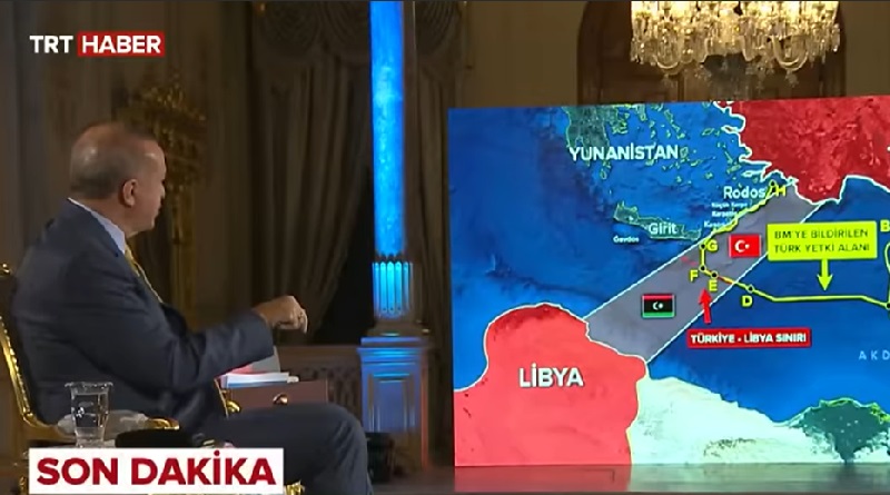 Ο Ρετζέπ Ταγίπ Ερντογάν υποστήριξε ότι η Τουρκία έχει αντικριστές ακτές με τη Λιβύη, όπως απαιτεί το διεθνές δίκαιο της θάλασσας, το οποίο και εφάρμοσε, κι αυτό έκανε την Ελλάδα να τρελαθεί.