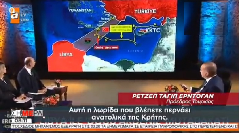 Προκαλώντας για ακόμα μια φορά ο Ερντογάν είπε χαρακτηριστικά: «Θέλω να σας δείξω κάτι. Αυτό εδώ το σημείο, είναι το σημείο σύνδεσης της Τουρκίας με την Λιβύη. Αυτή η λωρίδα που βλέπετε περνάει ανατολικά της Κρήτης. Το βόρειο τμήμα των συνόρων εδώ, είναι η Τουρκία και το νότιο τμήμα είναι η Λιβύη. Τι είναι αυτά; Αυτά είναι υφαλοκρηπίδες. Εμείς μπορούμε να πούμε πως εδώ μπορούμε να κάνουμε τις σεισμικές μας έρευνες. Και μετά τις σεισμικές μας έρευνες μπορούμε να κάνουμε και γεωτρήσεις εδώ».