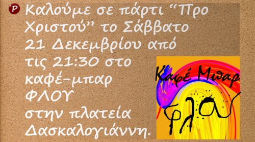 Το πάρτι “Προ Χριστού” του ιστότοπου “ΡΩΓΜΕΣ” http://rogmeshra.blogspot.com/ ante portas θα πραγματοποιηθεί το Σάββατο 21 Δεκεμβρίου στο καφέ μπαρ ΦΛΟΥ στην πλατεία Δασκαλογιάννη από τις 9.30 μ.μ., με δυνατές μουσικές μνήμες, που ζωντανεύουν ολόκληρες εποχές!Στην κονσόλα ο Μανόλης Ξυδούς! «Υπάρχει μια ρωγμή σε όλα. Από εκεί είναι που μπαίνει μέσα το φως» (Leonard Cohen)