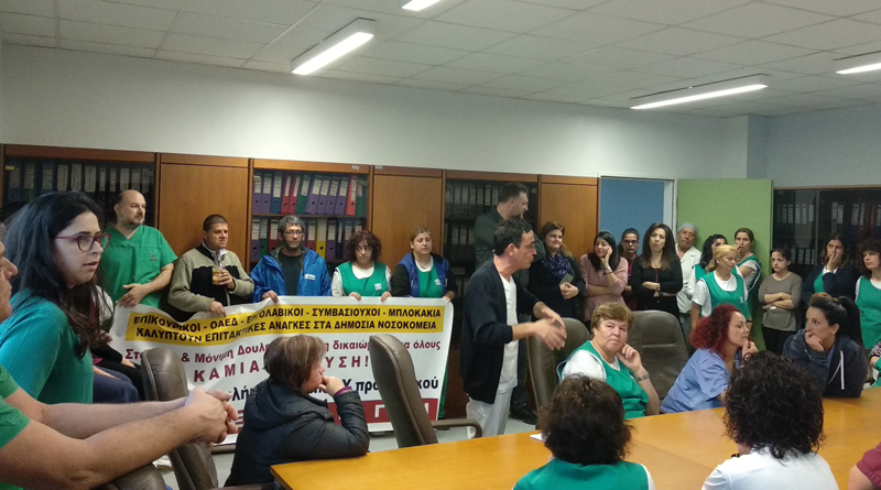 Με επιδεικτική απουσία μας «υποδέχτηκε» η διοίκηση του νοσοκομείου αφού δεν παραβρέθηκε κανένας στην παράσταση διαμαρτυρίας που κάναμε με τους εργαζόμενους στην καθαριότητα και τη σίτιση στα γραφεία της διοίκησης. Ο κύριος αναπληρωτής διοικητής προτίμησε να κάνει δημόσιες σχέσεις μοιράζοντας ευχές στα τμήματα, παρουσία της Διοικήτριας της 7ης ΥΠΕ, από το να συναντήσει το σωματείο εργαζομένων και τους εργαζόμενους που απολύονται τις επόμενες μέρες καθώς και αυτούς που ετοιμάζονται να υπογράψουν τις νέες απαράδεκτες συμβάσεις.