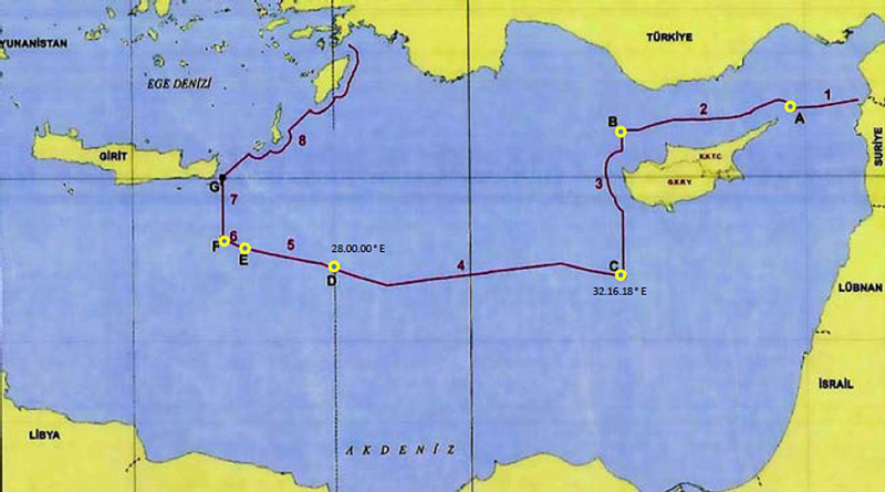 Στην επόμενη σελίδα παρουσιάζεται χάρτης με όλα τα τεμάχια, όπως τα έχει χωρίσει η Τουρκία και το ψευδοκράτος καλύπτοντας σχεδόν όλη την περιοχή της Ανατολικής Μεσογείου. Στον χάρτη του τουρκικού υπουργείου Εξωτερικών δεν αναγνωρίζονται η υφαλοκρηπίδα της Κύπρου και του Καστελλόριζου.