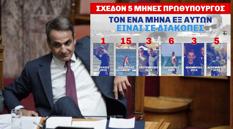 Όπως προκύπτει, από τους πέντε μήνες συνολικής διάρκειας της πρωθυπουργίας του Κ. Μητσοτάκη, τον έναν περίπου μήνα εξ αυτών βρίσκεται σε διακοπές.