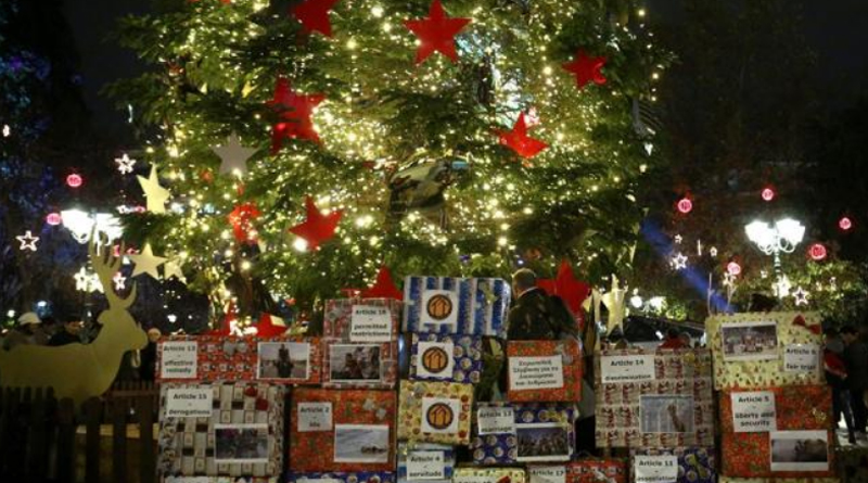 Σε μία συμβολική διαμαρτυρία για την στάση που τηρεί η ΕΕ στο προσφυγικό πρόσφυγες από την κατάληψη Νοταρά άφησαν κάτω από το χριστουγεννιάτικο δέντρο στο Σύνταγμα «δώρα» με τα 18 άρθρα για τα ανθρώπινα δικαιώματα.
