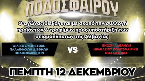Ένας φιλικός ποδοσφαιρικός αγώνας για καλό σκοπό, θα πραγματοποιηθεί στις 9 το βράδυ της Πέμπτης, ανάμεσα σε δύο ομάδες που στοχεύουν στη στήριξη των σεισμόπληκτων της Αλβανίας.Συγκεκριμένα ο αγώνας αυτός θα διεξαχθεί ανάμεσα σε παλαίμαχους διεθνείς ποδοσφαιριστές και στην Ένωση Αλβανών Ηρακλείου – Ποδοσφαιρική Ομάδα ILIRIA. Όπως αναφέρουν οι διοργανωτές, ο αγώνας διεξάγεται με σκοπο τη συλλογή προϊόντων και τροφίμων…