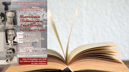 Το Πνευματικό Κέντρο Άνω Βιάννου “Περικλής Βλαχάκης” διοργανώνει βιβλιοπαρουσίαση την Τρίτη 10 Δεκεμβρίου στις 19.00 στην αίθουσα Μανόλης Καρέλης του Δήμου Ηρακλείου στην οδό Ανδρόγεω. Το βιβλίο που θα παρουσιαστεί έχει τίτλο “Βιαννίτικα Πολιτισμικά Σκιρτήματα τον 20ό και 21ο αι” του γιατρού πολιτισμολόγου Αγησίλαου Κ. Αλιγιζάκη, ο οποίος το συνέγραψε σύμφωνα με τις προσλαμβάνουσες που είχε όλα αυτά τα χρόνια…