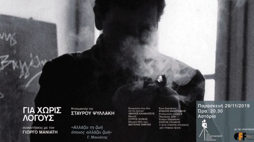 Η Νέα Κινηματογραφική Λέσχη Ηρακλείου υποδέχεται τον Σταύρο Ψυλλάκη την Παρασκευή 29 Νοεμβρίου στις 20:30, στο κινηματοθέατρο Αστόρια. Το κοινό του Ηρακλείου θα έχει την ευκαιρία να παρακολουθήσει σε πρώτη προβολή το νέο του ντοκιμαντέρ με τίτλο «Για Χωρίς Λόγους: συναντήσεις με τον Γιώργο Μανιάτη», παρουσία του σκηνοθέτη. Μετά την προβολή θα ακολουθήσει συζήτηση με τον δημιουργό. Για Χωρίς Λόγους:…