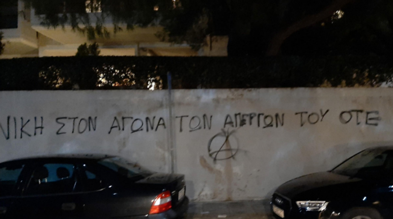 «Νίκη στον αγώνα απεργών του ΟΤΕ» έγραψαν χθες βράδυ μέλη του «Ρουβίκωνα» σε τοίχο έξω από το σπίτι του διευθύνοντος συμβούλου του Οργανισμού εκφράζοντας τη στήριξη τους στην απεργία διαρκείας των εργαζομένων του.