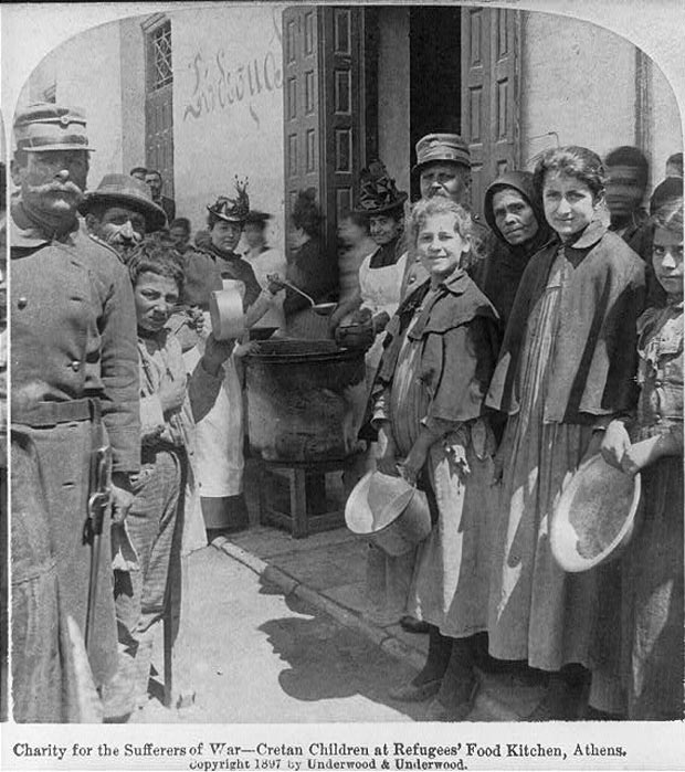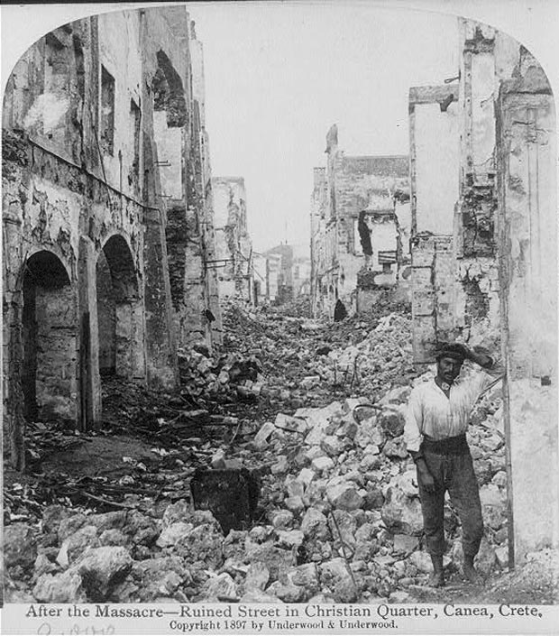 Στην κεντρική φωτογραφία, άνδρες των ευρωπαϊκών δυνάμεων ποζάρουν για αναμνηστική φωτογραφία στα ερείπια των σπιτιών των χριστιανών των Χανίων! Η φωτογραφία, χαρακτηριστική για τη στάση των ευρωπαϊκών δυνάμεων, είχε δημοσιευτεί στο αυστριακό βιβλίο “Die k. und k. Streitkrafte auf und vor Kreta 1897/1898”, που αναφερόταν στην παρουσία των αυστριακών στρατευμάτων στην Κρήτη και κυκλοφόρησε στη Βιέννη το 1901. Η Αυστροουγγαρία και η Γερμανία συμπεριλαμβάνονταν στις «προστάτιδες» της Κρήτης δυνάμεις, αλλά αποχώρησαν μετά τον ελληνοτουρκικό πόλεμο που ακολούθησε την επέμβαση της Ελλάδας στην Κρήτη. Οι Γερμανοί, στην ουσία, προκάλεσαν την κήρυξη του πολέμου από την οθωμανική αυτοκρατορία, θέλοντας να πιέσουν την Ελλάδα για τα χρήματα που ζητούσαν ιδιώτες Γερμανοί ομολογιούχοι, από το 1894!
