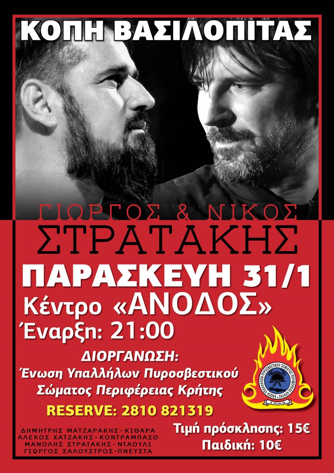 Η Ένωση Υπαλλήλων Πυροσβεστικού Σώματος Περιφέρειας Κρήτης όπως κάθε χρόνο διοργανώνει την χοροεσπερίδα της στις 31 Ιανουαρίου στην “ΑΝΟΔΟ” παρέα με το συγκρότημα των Νίκου και Γιώργου Στρατάκη.