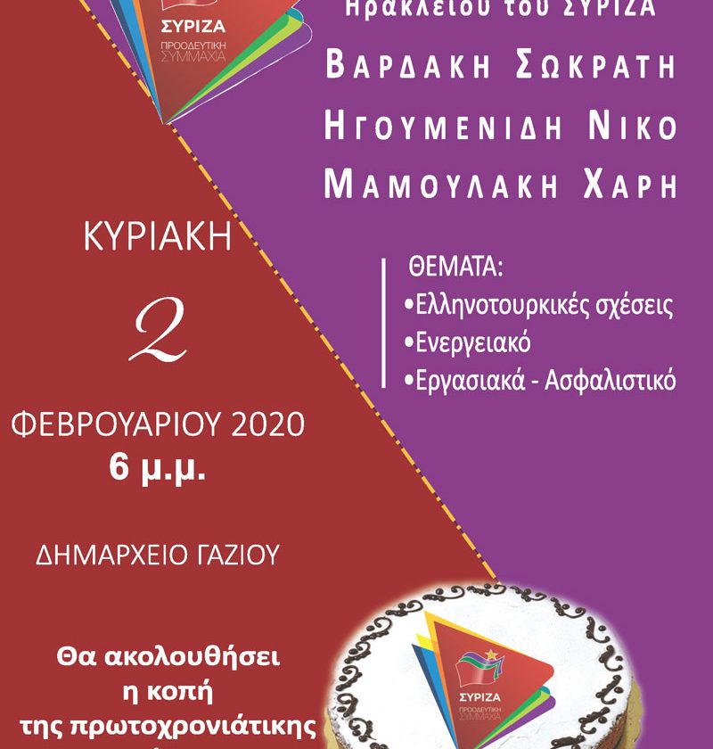 Μετά τη συζήτηση θα πραγματοποιηθεί η κοπή της πίτας της ΟΜ Μαλεβιζίου του ΣΥΡΙΖΑ στα γραφεία της οργάνωσης, που βρίσκονται στον κεντρικό δρόμο (Ελευθερίου Βενιζέλου 211) στο Γάζι.