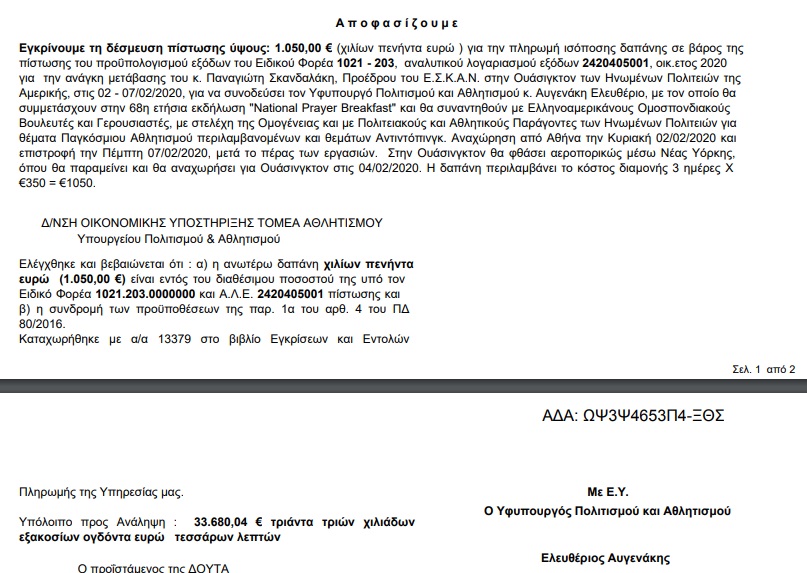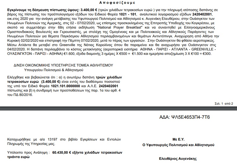 Κι ενώ όλοι αναζητούσαν τον υφυπουργό Αθλητισμού, εκείνος υπέγραφε τη δέσμευση ποσού 3.400 ευρώ για να ταξιδέψει στις ΗΠΑ και συγκεκριμένα στην Ουάσινγκτον ώστε να παραστεί στην εκδήλωση NATIONAL PRAYER BREAKFAST, η οποία σε καμιά περίπτωση δεν αποτελεί σοβαρή θεσμική υποχρέωση της ΓΓΑ. Μάλιστα για κάθε μέρα παραμονής του στις ΗΠΑ θα παίρνει και… εκτός έδρας μεροκάματο 100 ευρώ!