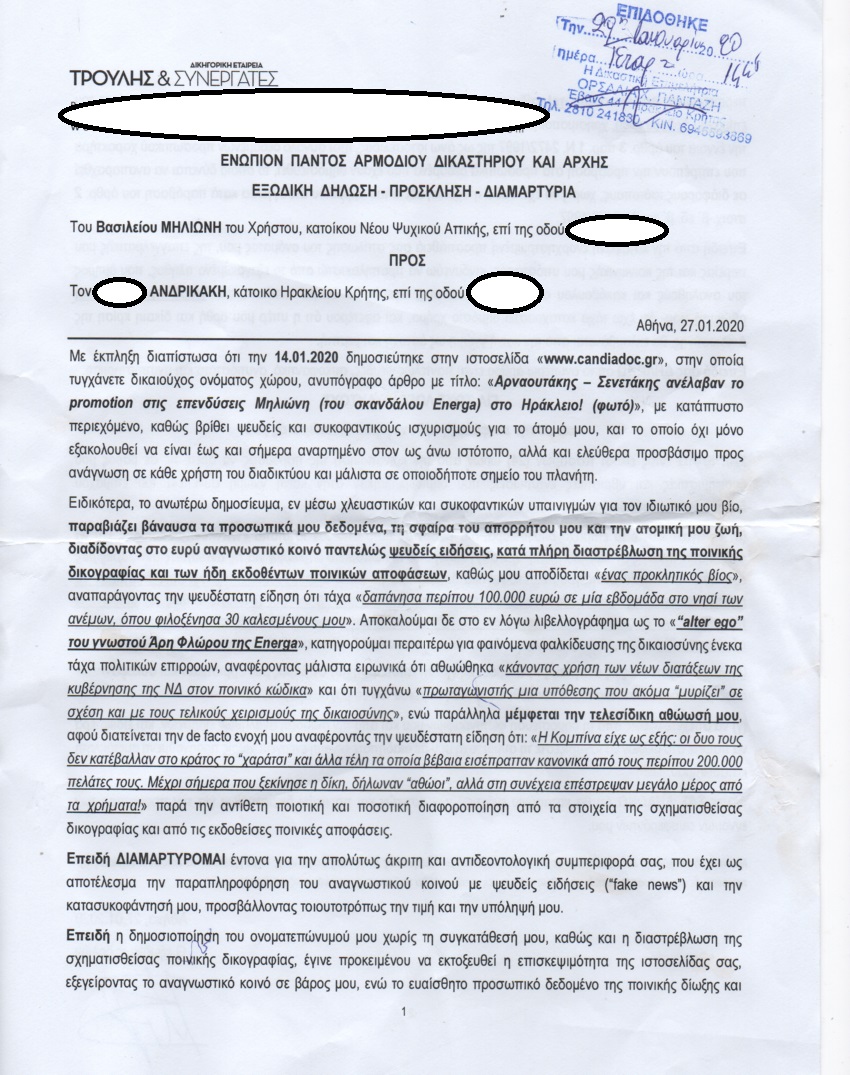 Με έναν απίστευτο τρόπο ο επιχειρηματίας Βασίλης Μηλιώνης επιχειρεί να εκφοβίσει το Candiadoc, επειδή… τόλμησε να αναφέρει ότι κατηγορήθηκε μαζί με τον γνωστό Άρη Φλώρο για το σκάνδαλο Energa, καταδικάστηκε σε πρώτο βαθμό και αθωώθηκε σε δεύτερο, με μια δικαστική απόφαση που επί καιρό σχολιάστηκε από μεγάλο μέρος των μέσων ενημέρωσης! Ο κ. Μηλιώνης επιχειρεί μια πρωτοφανή επίθεση στο site, με εξώδικο που μάλιστα δεν απηύθυνε στον νόμιμο εκπρόσωπο του Candiadoc (είναι ο δημοσιογράφος Αλέκος Α. Ανδρικάκης, όπως αναφέρεται και στην αρχική σελίδα του site) σε… συγγενικό του πρόσωπο, το οποίο δεν έχει άλλη σχέση με το Candiadoc παρά μόνο την πρώτου βαθμού συγγένεια με τον νόμιμο εκπρόσωπο!