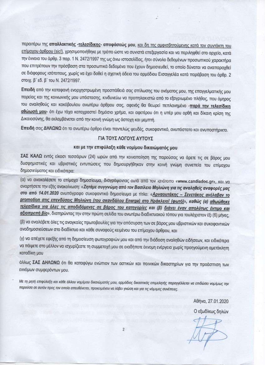 Ανάμεσα στα άλλα, κι επειδή γράψαμε ότι του έκαναν promotion στις επιχειρηματικές του δραστηριότητες στο Ηράκλειο ο περιφερειάρχης Κρήτης, Σταύρος Αρναουτάκης και ο βουλευτής της ΝΔ, Μάξιμος Σενετάκης, (δείτε: Αρναουτάκης – Σενετάκης ανέλαβαν το promotion στις επενδύσεις Μηλιώνη (του σκανδάλου Energa) στο Ηράκλειο! (φωτο), απαιτεί να… διαγράψουμε το ρεπορτάζ, εντός μάλιστα 24 ωρών, να… ζητήσουμε συγγνώμη από τον ίδιο με μια ανακοίνωση στην οποία θα βεβαιώνουμε τους Έλληνες ότι διάγει έναν απόλυτα νόμιμο βίο, δήλωση που αξιώνει να υπάρχει…. επί 6 μήνες στην αρχική σελίδα του Candiadoc!